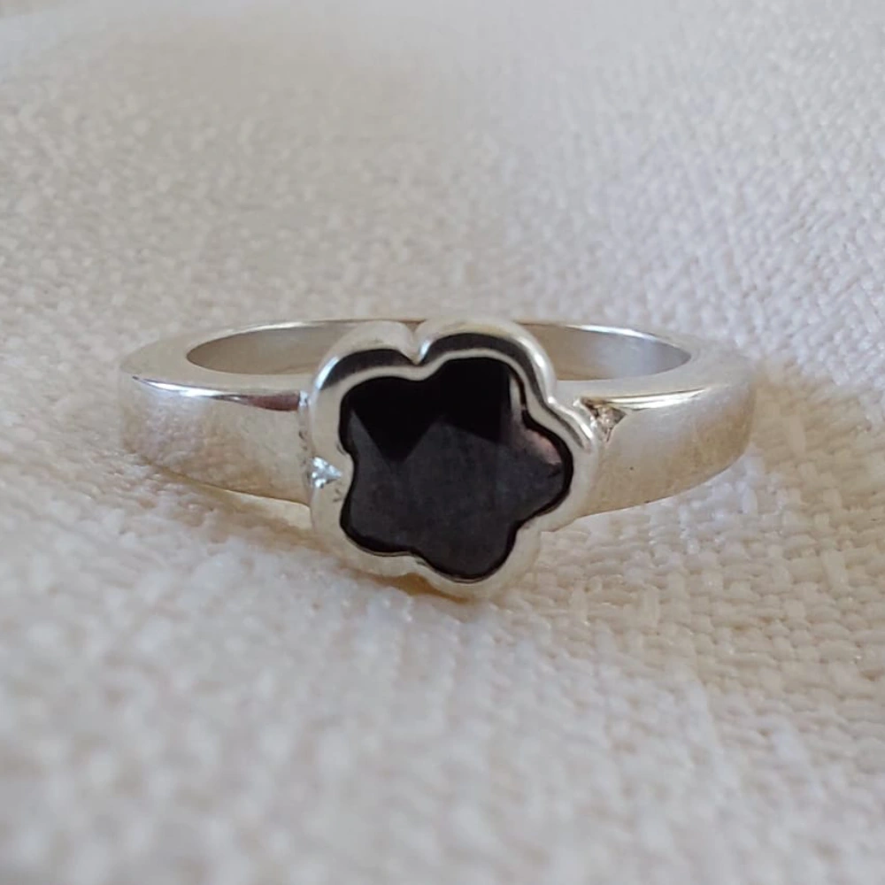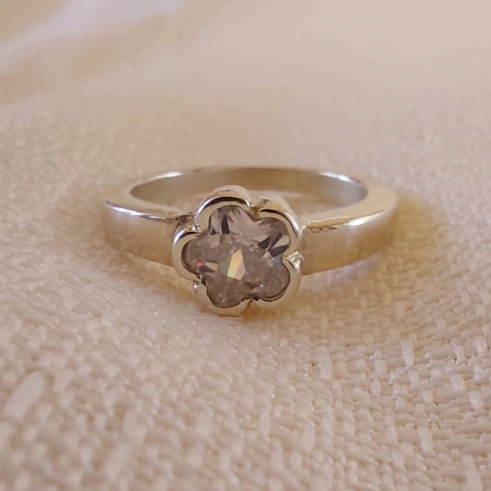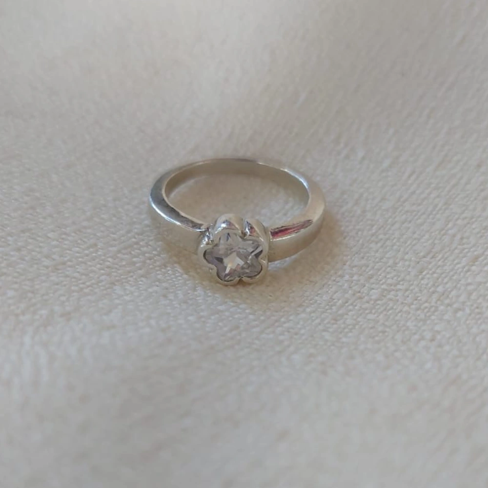 Anillo elaborado en plata 925 , caracterizado por su elegancia y delicadeza. Su diseño presenta un cabezal en forma de flor. La flor es de strass , imita el brillo de los diamantes, aportando un toque de brillo y sofisticación. Este anillo combina la durabilidad de la plata de ley con la belleza luminosa de los strass, ideal para complementar looks elegantes o para añadir un detalle delicado al uso diario.
